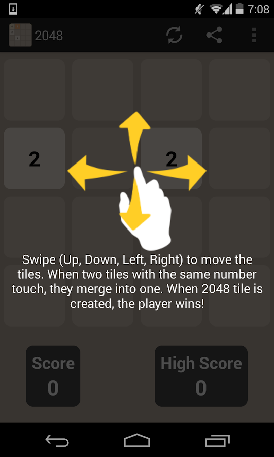 Swipe (cima, baixo, esquerda, direita) para mover as peças. Quando duas peças com o mesmo número se toque, eles se fundem em um só. Quando 2048 telha é criado, o jogador ganha!