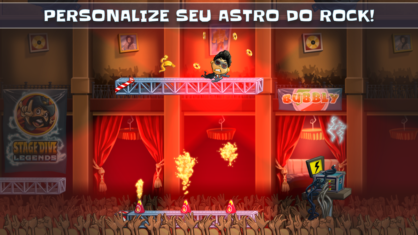 Quebre a guitarra, corra e pule sobre a multidão que vibra! Surfe pelo ambiente e seja carregado pelos fãs alucinados. Faça acrobacias insanas, colete moedas de ouro e use power-ups incríveis para entreter a platéia! Evite os obstáculos voadores como bombas, bananas e um ou outro hambúrguer.